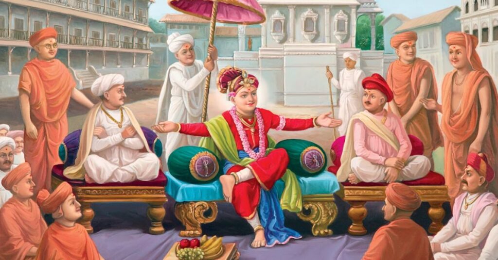 One month and one day later, in Fareni, Ramanand Swami departed his mortal body and ascended to Akshardham. On the fourteenth day following Ramanand Swami’s departure, Sahajanand Swami convened a grand sabha and instructed everyone to chant a single name – “Swaminarayan.” As they chanted, all of those who were present entered a state of samadhi (deep meditative trance), witnessing their own preferred deity within Sahajanand Swami Himself. This unique and extraordinary manifestation undeniably affirmed Sahajanand Swami as Purna Purushottam Narayan.