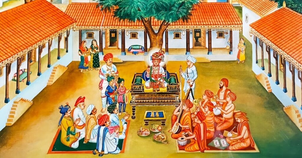 In Loj, there stood an ashram founded by Sadguru Shree Ramanand Swami (reincarnation of Uddhavji and head of the Uddhav Sampraday). One morning, at the village’s step-well (vav), the local women and Shukanand Swami caught sight of Bhagwan (Nilkanth Varni). Shukanand Swami, a devoted disciple of Ramanand Swami, respectfully invited Nilkanth Varni and escorted him to the ashram. Ramanand Swami was in Bhuj at the time, but Muktanand Swami, the senior-most disciple of Ramanand Swami, extended a warm welcome.