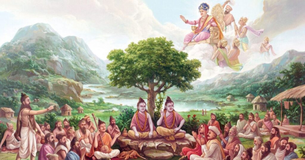 The genesis of Bhagwan Shree Swaminarayan’s earthly manifestation began at Badrikashram, where Bhagwan Shree Narnarayan was holding a sabha. In attendance were revered figures such as Dharma, Bhakti, and Uddhavji. Their profound absorption in the katha led them to inadvertently overlook the arrival of Durvasa Rishi. Angered by this perceived slight, Durvasa Rishi gave a shaap (curse), condemning all those who were present in the sahba to be born on Earth and endure suffering at the hands of demonic forces. However, this was, in essence, a divine episode orchestrated by Bhagwan Himself. Reassuring everyone, Bhagwan Narnarayan instructed Dharma and Bhakti to prepare, promising to incarnate as their son.