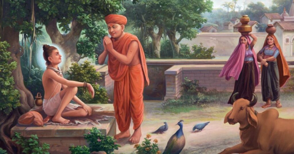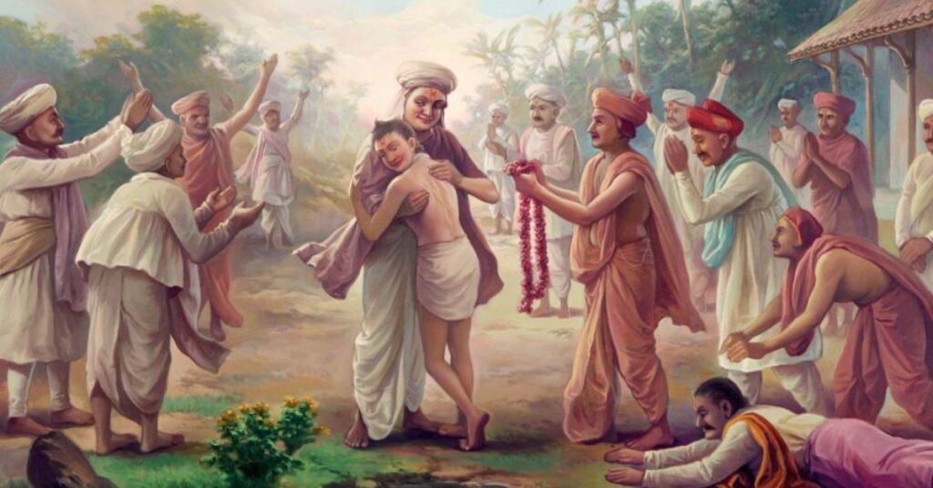 Upon seeing Sarjudas, Ramanand Swami immediately rose, extending a heartfelt and loving embrace. He instantly recognized Sarjudas as Parabrahm Purushottam Narayan (Almighty God Supreme). Ramanand Swami then inquired about Sarjudas’s parents, His childhood, and the van vicharan that had ultimately led Him to Loj.