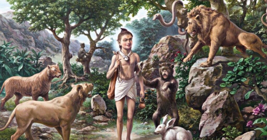 At the age of 11 years, 3 months, and 1 day, Ghanshyam renounced His home to begin His divine journey across the Indian subcontinent, known as Van Vicharan. He carried only a few essentials: a Shaligram (for worship), a mala (rosary), his small book (Gutko), a water pot (Kamandal), and minimal clothing (Kopin).