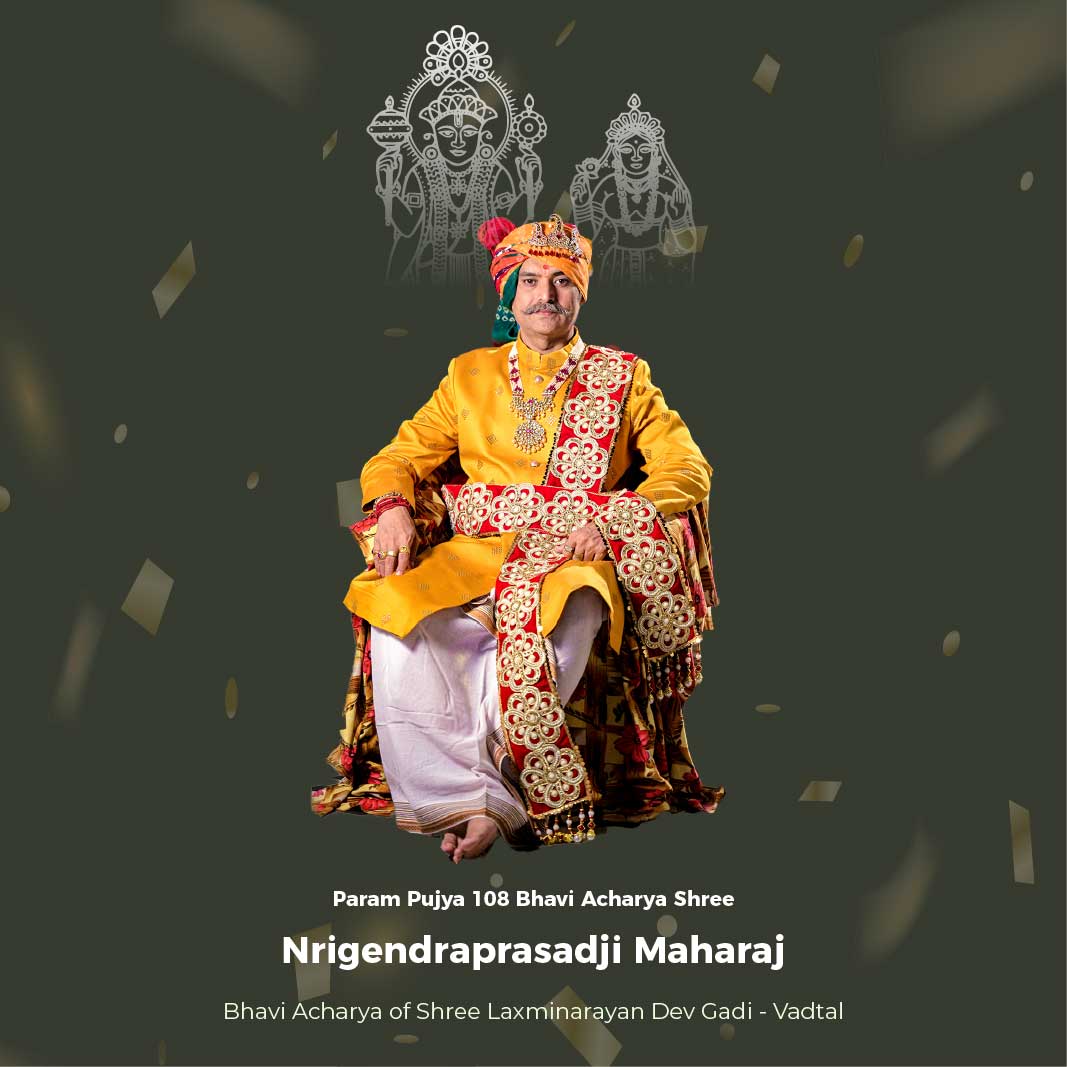 On March 14th, 1974 (Fagan Vad 5 V.S. 2030), also known as Rang Panchami, H.H. 108 Lalji Shree Nrigendraprasadiji Maharaj was born. His personal achievements and talent is unparalleled to anything. Following in the footsteps of his father and grandfather, Lalji Maharajshree has acquired skills in higher education in law as well as in reading and commentating on the Vedic scriptures.