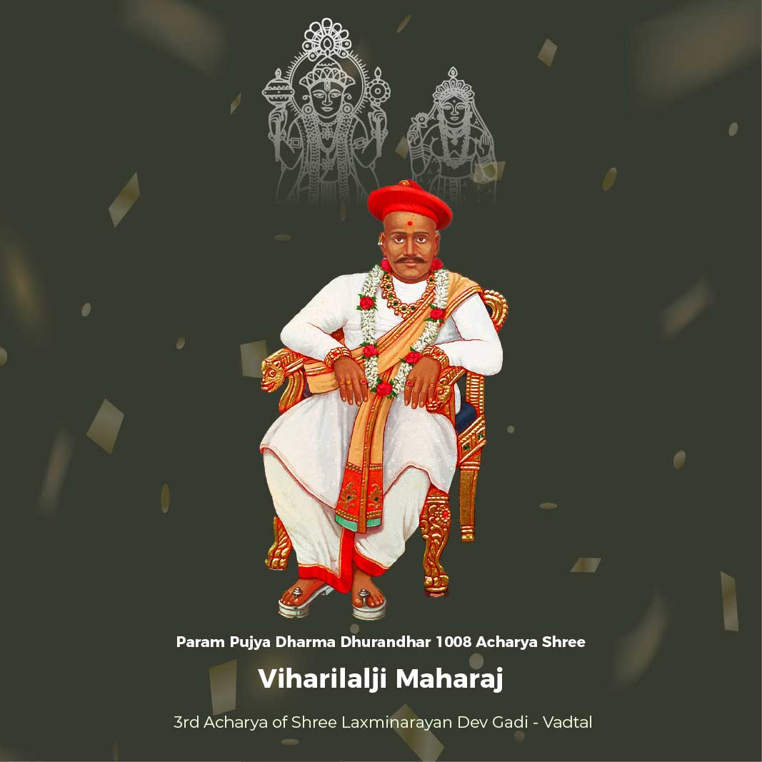 Acharya Shree Viharilalji Maharaj was born on Chaitra Amas V.S. 1908 (April 19, 1852) in a village called Duboli in Uttar Pradesh to Krishnaprasadji and Chaturdashi Devi. At the age of 8, he moved to Vadtal where he received his Yagnopavit Sanskar and studied the Vedas. Later he received his Gurumantra and Diksha from Acharya Shree Raghuviriji Maharaj.
